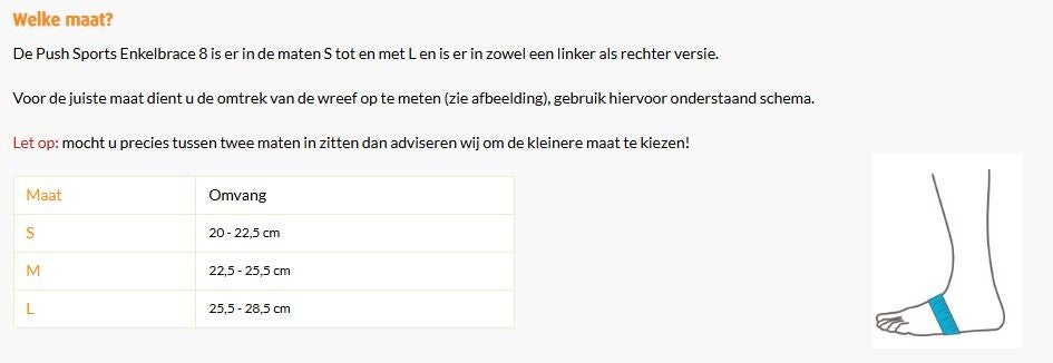 De Push Sports Enkelbrace 8 is gemaakt om steun te bieden bij een lichte of bijna herstelde enkelverzwikking. De ultradunne enkelbrace stabiliseert de enkel door een uniek systeem van een elastische band dat in de vorm van een 8 rond de enkel gewikkeld wordt. Dit geeft de brace een aangename en vooral stevige compressie, wat ervoor zorgt dat men tijdens het sporten een comfortabel en zeker gevoel heeft.